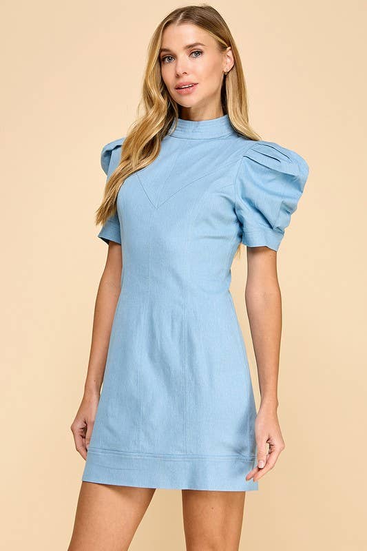 Fitted denim dress featuring puffed sleeves, a highneck, and a hidden rear zipper for a sleek.