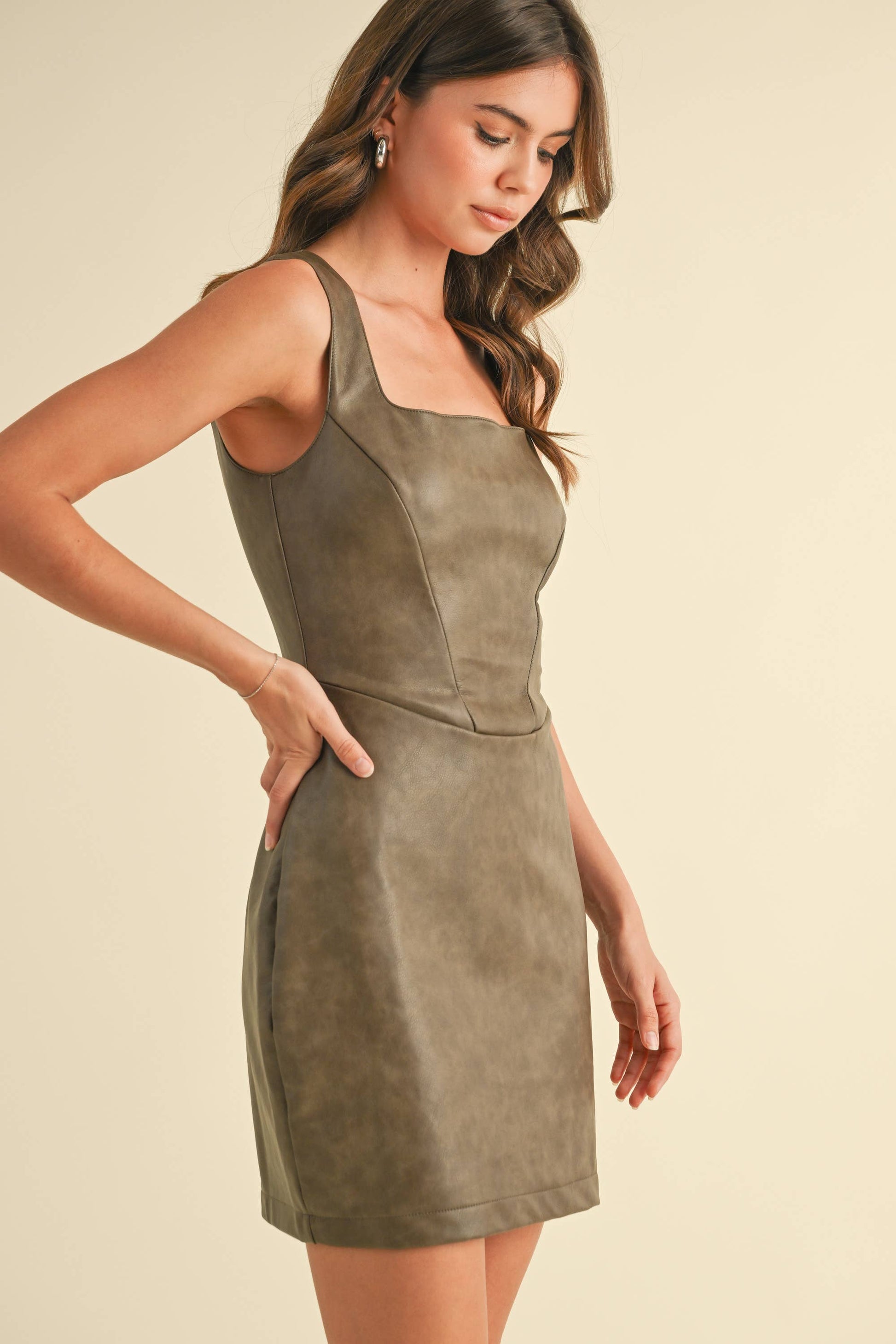 WASHED FAUX LEATHER SQUARENECK MINI DRESS
